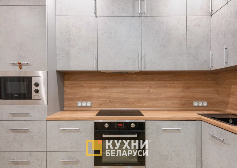 Компактный угловой гарнитур «ПЯ903» — это смесь современного минимализма и скандинавского уюта. Мебель изготовлена в светло-сером оттенке, под мрамор. Но столешница и стеновая панель под дерево смягчает холодный эффект и придает домашнего тепла. Светлая цветовая гамма и отсутствие выраженного декора визуально делает помещение просторнее и легче.